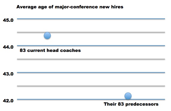 Maybe we’d see more of a Shaka-effect at the mid-major level, but the 83 major-conference head coaches in place today were, on average, 44.4 years old on the day they were introduced to the press. Conversely, their predecessors were a mere 42.2 years old as new hires.