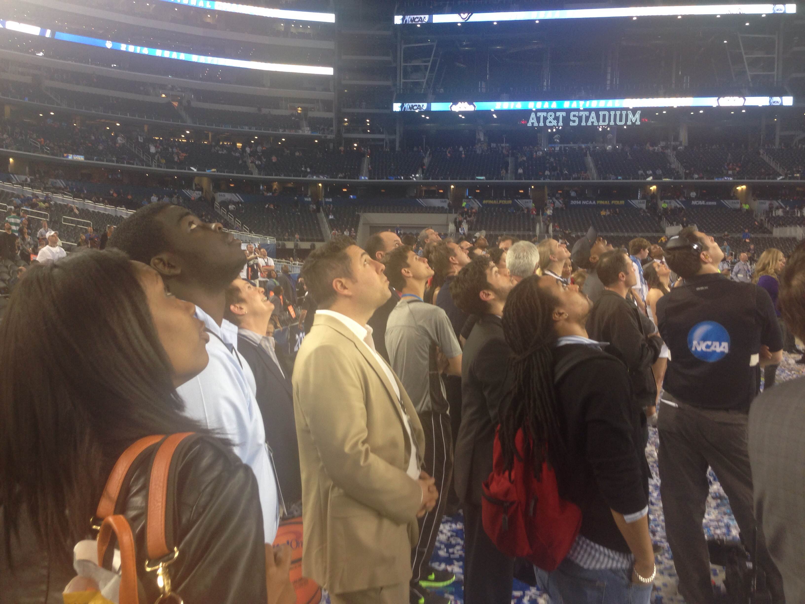 Members of the media watch “One Shining Moment” on the mammoth HD screen above the court at AT&T Stadium after the national championship game.