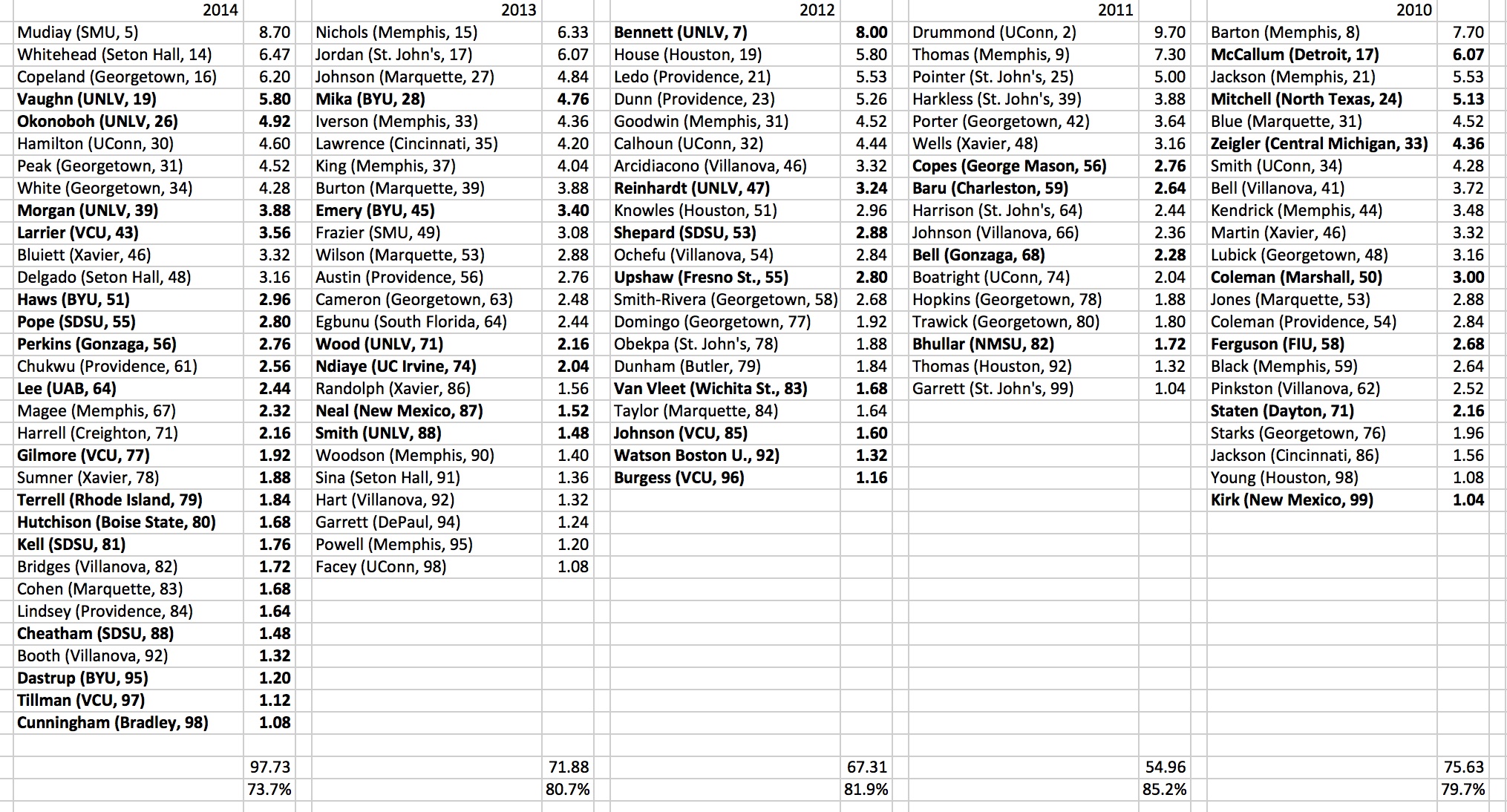 Don’t get me wrong, there are obviously some great players listed here. Anthony Bennett was the No. 1 overall pick in the 2013 NBA draft (though one might venture to say this was based more on potential than on actual college production), Otto Porter was a first-team All-American, and anyone who says they wouldn’t want Fred VanVleet playing for their team is clearly not paying attention.