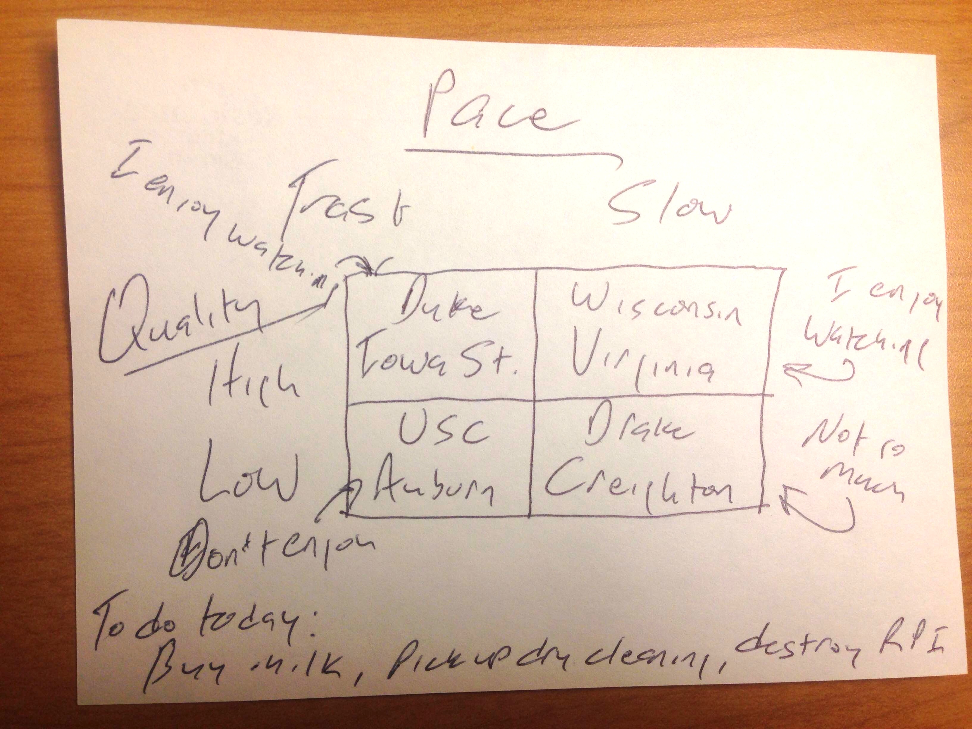 I for one don’t fret about successful slow-paced teams like Wisconsin or Virginia causing other teams to go slow. If other coaches do indeed choose to decelerate, my happiness in watching their games will be a function primarily not of pace but of quality. Basically I like good hoops at any speed.