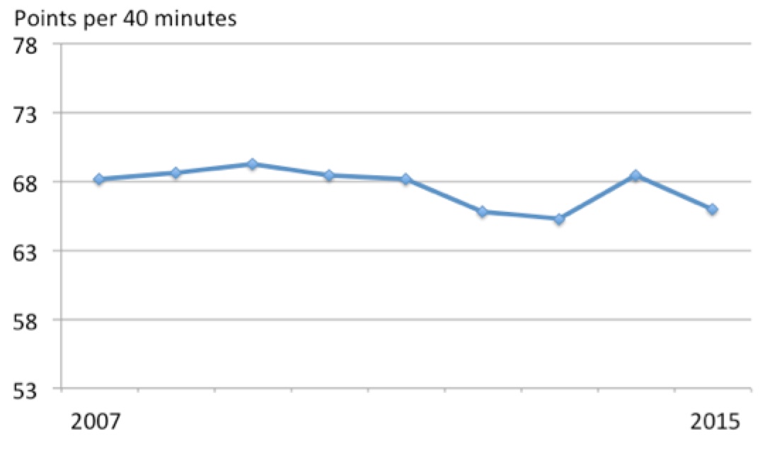 But let’s forget visuals entirely and stick to math. If we use 2007 as a baseline, the lowest figure we’ve seen for scoring in major-conference play since that time was a four percent decline from said benchmark in 2013. Meaning our worst-case scenario here is four percent. These numbers suggest to me that the news peg for scoring in major-conference basketball in recent years isn’t “decline,” much less “crisis,” but rather “numbing consistency.” (And if you’re thinking this all sounds suspiciously familiar, you’re correct: I am merely restating some points that have already been made in a rather more timely manner by Brian Cook.)